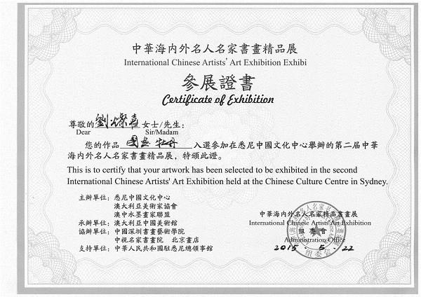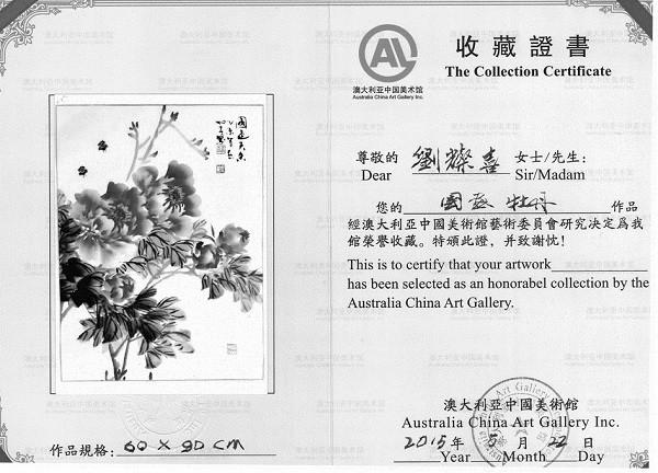 2014年,应澳大利亚美术家协会主席彭伟开邀请,参加澳大利亚华人国际国画展,国画《国色天香》被澳大利亚中国美术馆荣誉收藏。同年,参加悉尼中国文化中心举办的第二届海内外名人名家书画精品展,并被收藏。